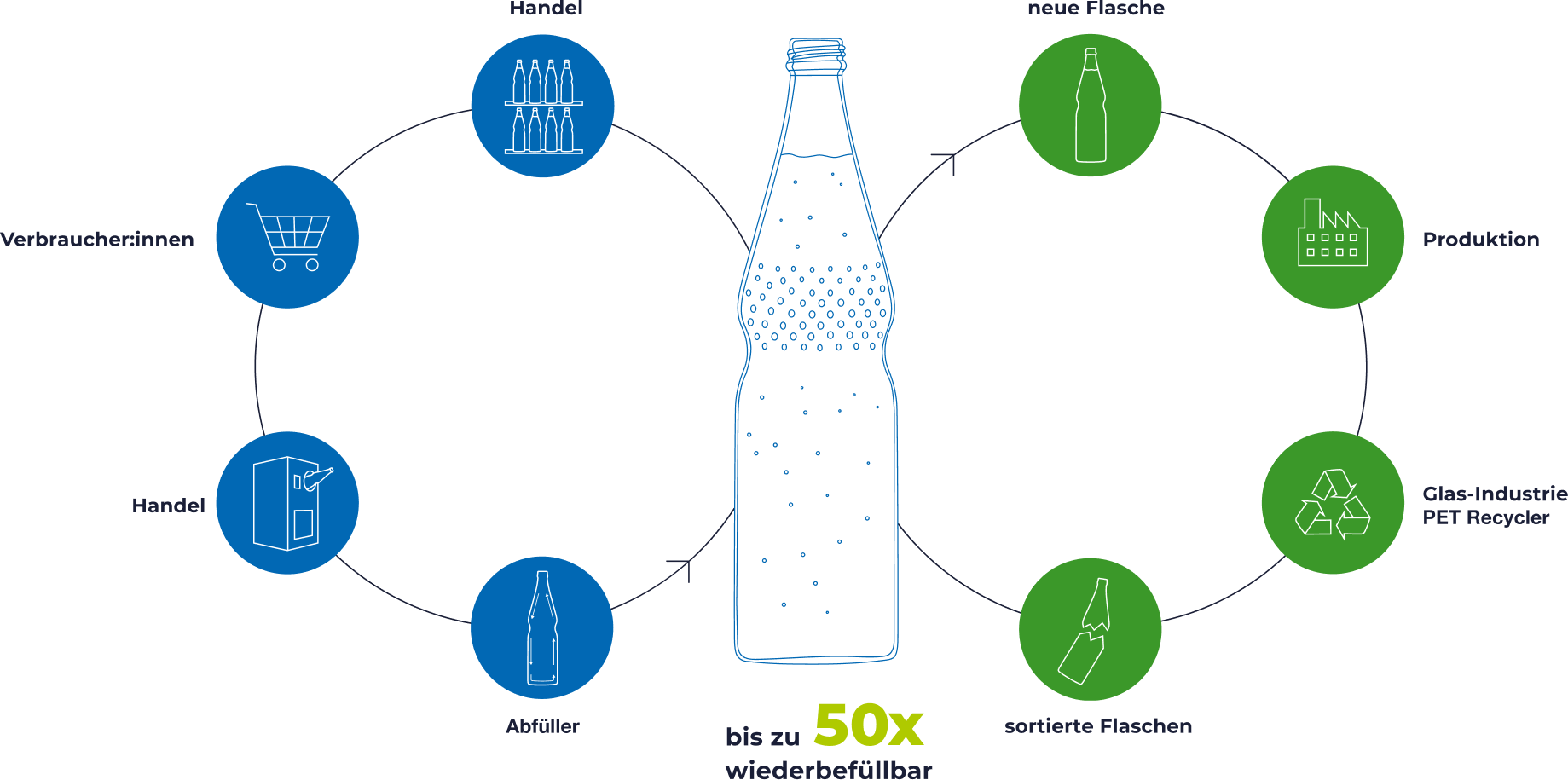 Das deutsche Verpackungsgesetz sagt, dass Mehrwegflaschen der gleichen Form, Art und Größe dort zurückgenommen werden müssen, wo sie auch verkauft werden. Das heißt, dass sogenannte Poolmehrwegbehälter – also zum Beispiel die Perlenflasche für Mineralwasser, die Long-Neck-Flasche oder das Joghurtglas – überall dort zurückgenommen werden müssen, wo sie auch verkauft werden, unabhängig welches Etikett drauf ist.